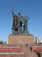 В годы Великой Отечественной войны тысячи пермяков храбро сражались на фронте. А в тылу их матери, жены, дети работали под лозунгом: «Все для фронта, все для Победы!» Пермяки делали пушки, снаряды, бронекатера и другую военную продукцию. С первых дней войны началась эвакуация заводов и людей с территорий, которые мог захватить враг. В Перми оказалось 124 таких предприятий. В очень короткие сроки они вступили в строй. Рабочие трудились день и ночь, чтобы заработал очередной завод. Эвакуированных людей размещали в квартирах пермяков, в школах, гостиницах. Классы стали палатами, вместо парт в них ставили койки. Уральцы делились с приехавшими одеждой, продуктами, теплом. Поэтому самый большой и величественный памятник поставлен в центре города. Это памятник всем пермякам – Героям фронта и тыла. Скульптор В.М. Клыкова, архитекторы - Р.И. Семерджиев, В.И. Снегирев